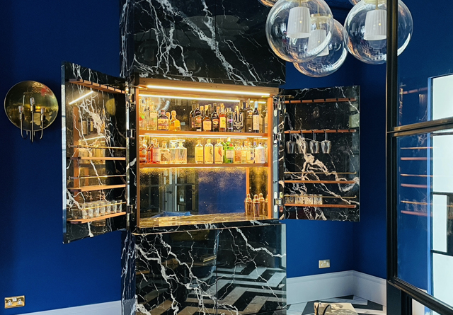 Thanks to our own specialist light-weight stone, we at Grama Blend have worked side by side with Jack Trench Design to create this stunning Nero Marquina drinks bar, made possible by using our unique light-weight stone. Nero Marquina is a highly sought-after variety of marble due to the striking contrast between the deep black colour and the bright white veining.
